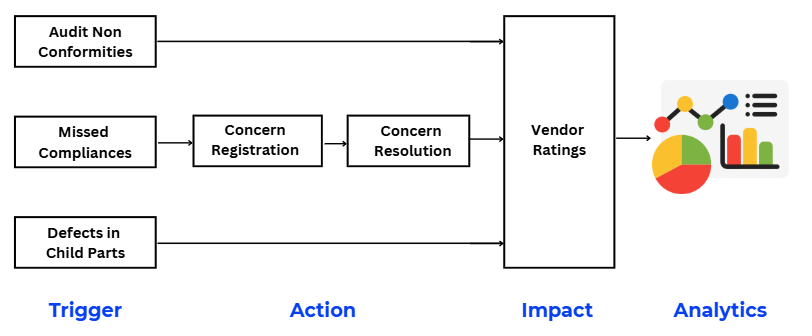 Seamlessly link triggers (defects/audits) to actions (Kaizen/CAPA/Resolution) and impact (Vendor Ratings)/p>